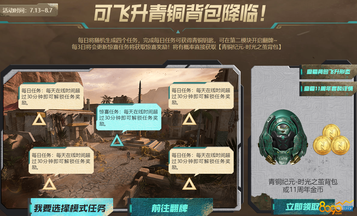 玩家每日将随机生成四个任务,完成每日任务可获得青铜钥匙,可在第二模块开启翻牌。累计完成8个任务之后,即可直接领取青铜纪元-时光之茧背包或11周年金币。青铜套装可以用活动获取的飞升道具转化为智械套装,增加飞升特效并提升属性。