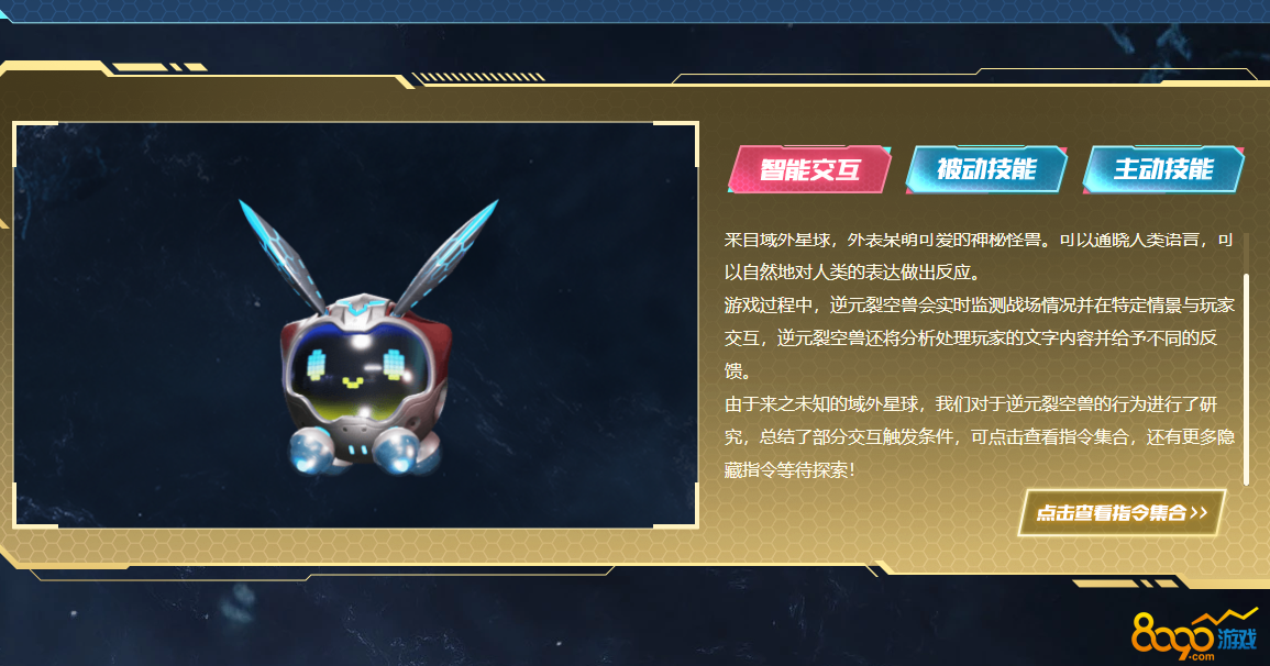 来自域外星球,外表呆萌可爱的神秘怪兽。可以通晓人类语言,可以自然地对人类的表达做出反应。游戏过程中,逆元裂空兽会实时监测战场情况并在特定情景与玩家交互,逆元裂空兽还将分析处理玩家的文字内容并给予不同的反馈。