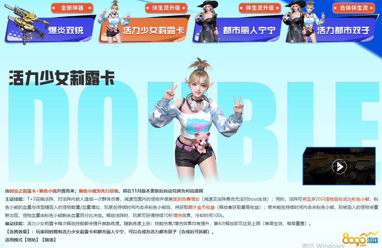 活力少女莉露卡:由时空之莉露卡+粉色小熊升级而来;粉色小熊为先行信物,将在11月版本更新后自动兑换为对应道具
