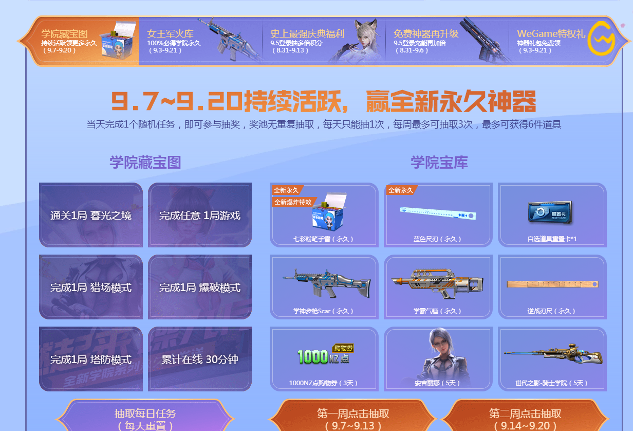 1、学院藏宝图持续活跃领更多永久(9.7-9.20)