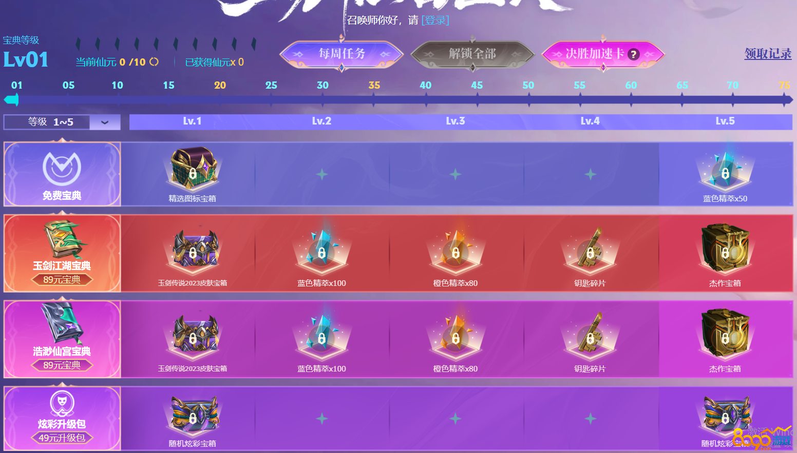 活动分为免费宝典、玉剑江湖宝典、浩渺仙宫宝典这3条路线,玉剑江湖宝典、浩渺仙宫宝典分别需要消耗89元解锁,付费49元可解锁“炫彩升级包”获得更多奖励,175元可解锁全部宝典及升级包。付费宝典升级共可分别获得11个盲盒。